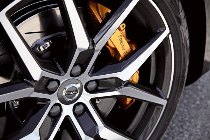 It is the Polestar Engineered model we’ve driven here. The flagship is distinguished from the standard T8 by gold brake calipers, a 12mm ride-height squat and a set of dazzling 20in Y-spoke alloy wheels shod in 245-section Pirelli P Zero tyres. Power is also up to 405bhp, with roughly 90bhp of that delivered by the rear-mounted electric motor, and spring rates are increased by 5% compared with Volvo’s existing R-Design sports chassis.