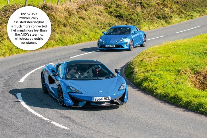 And that, we can conclude, is what connects these two cars most intimately. Rather than being so fast and so downright grippy that they feel caged in on the public highway, the A110 and 570S are accessible and even playful at road speeds. That is what makes them two of the most enjoyable performance cars on sale today, and to spend a day driving them is to realise what a pity it is that many other sports cars and supercars are made less enjoyable to drive over a moorland road by the vanity quest to be fastest on a circuit. A