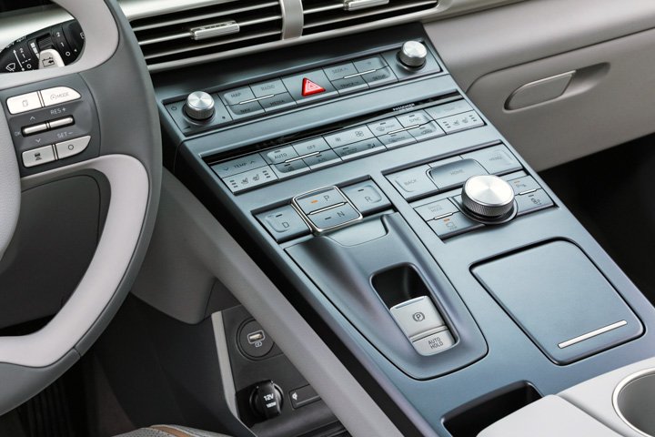 The problem with touchscreens is that, so far, they have no haptic response. You can’t feel what you’re touching, forcing drivers to take their eyes of the road. Buttons are at least tactile: the switches in Hyundai’s Nexo fuel cell EV are an example of great design with large buttons that have a significantly different feel and shape so you can quickly learn what you’re touching.