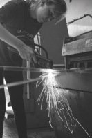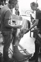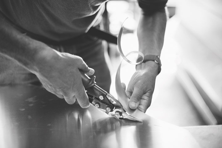 The English Wheel is the simplest of devices but incredibly difficult to master. As you can see (left), it is a giant ‘G’ with a pair of rollers. There are three at G&A, each fitted with a pair of rollers that have different profiles. One pair is nearly flat, another has a pronounced curve and the one that Grace and I are using is midway between the others. It’s a nerve-racking business, this wheeling. Roaf gets us started, gently pulling and pushing the metal back and forth between the rollers, carefully applying pressure with her hands to encourage the shape. It’s a very delicate balance between not enough force and so much that you put a crease in it that turns it into scrap. When it’s my turn, I don’t apply enough pressure, and after dozens of passes between the rollers, the sheet has not changed shape at all.